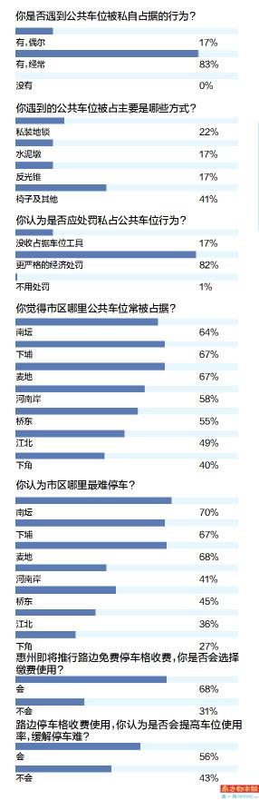 “你是否遇到公共停车位被占的情况,觉得市区哪里最难停车,车位收费停放你是否会使用?”针对市区停车难问题,南都惠州通过网络进行民意调查,共有79人参与,数据显示,其中65名受访者表示在市区开车时经常遇到公共停车位被占据行为,有的车位被安装地锁,还有用反光锥、水泥墩或者桌椅等占车位的。对于公共车位被私人占据,虽然目前相关执法部门也定期进行执法,清障释放车位资源,但是受访的人群中有81%都表示,目前的管理措施还不够严格,需要对私占车位的行为进行更严厉的处罚。