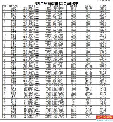 依照国家有关法律法规、司法解释和政策规定,请下列债务人及相应的担保人或其继承人立即向中国邮政储蓄银行股份有限公司惠州市分行或其下辖支行履行还款义务或承担担保责任(若借款人、担保人因各种原因发生更名、改制、歇业、吊销营业执照或者丧失民事主体资格等情形,请相关承债主体、清算主体、主管部门代为履行义务或者承担清算责任)。下列债务己全部逾期,债务人己构成违约,请立即履行还款义务或承担担保责任。特此公告。