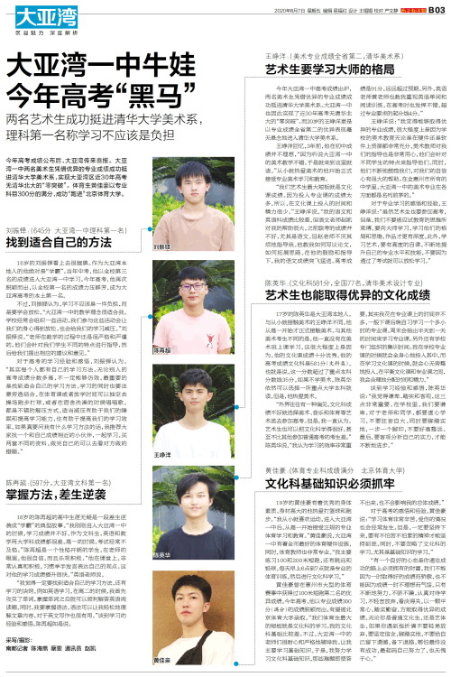 今年高考成绩公布后,大亚湾传来喜报。大亚湾一中两名美术生凭借优异的专业成绩成功挺进清华大学美术系,实现大亚湾区近30年高考无清华北大的“零突破”。体育生黄佳豪以专业科目300分的满分,成功“跑进”北京