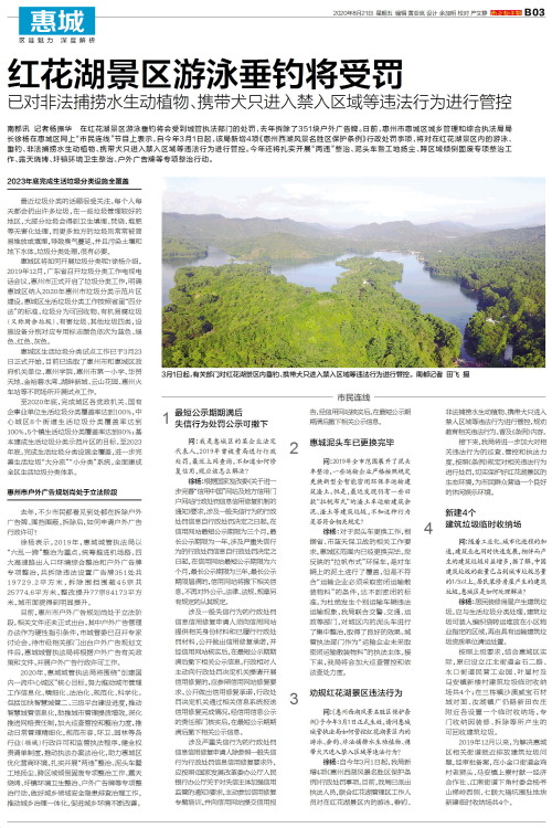 南都讯 记者杨振华 在红花湖景区游泳垂钓将会受到城管执法部门的处罚,去年拆除了351块户外广告牌。日前,惠州市惠城区城乡管理和综合执法局局长徐杨在惠城区网上“市民连线”节目上表示,自今年3月1日起,该