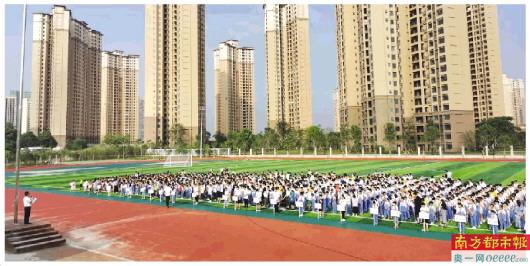 博罗中学佳兆业学校在宽敞的足球场举行升旗仪式。