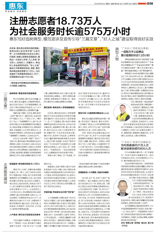 近年来,惠东县注重写好选树典型、模范宣讲以及宣传引导“三篇文章”,大力培育和践行社会主义核心价值观,助推公民思想道德建设,涌现出一大批好人好事、凡人善举,学习好人、崇尚好人、关爱好人、争当好人在全县蔚