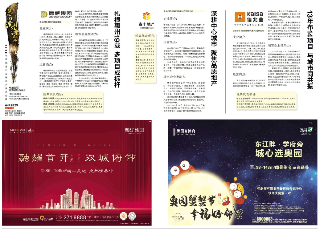 企业名称:佳兆业地产(惠州)有限公司企业简介:作为国内房企TOP30、千亿佳兆业集团的重要城市布局,佳兆业惠州公司成立于2007年。入惠13载以来,截至2020年9月,佳兆业惠州公司已开发建设14个城