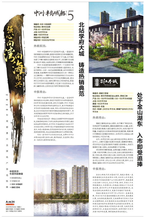 楼盘名:中洲·半岛城邦物业地址:惠州北站旁产品:97-165平方米占地:50万平方米建面:158万平方米销售状态:在售五期销售均价:10000元/平方米热销原因:中洲·半岛城邦作为片区的标杆大盘,一直