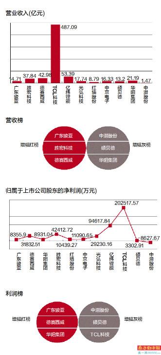 本月初,科翔电子登陆创业板,成为注册地在惠州的第12家上市公司。日前,惠州其它11家本地注册上市企业陆续发布了2020年三季报,11家惠州上市企业前三季度总营收超过700亿,达到714.73亿,其中TCL科技占了大半,为487.09亿,TCL科技经过重组后,其总资产再次突破2000亿大关,为2002亿。上半年,惠州11家上市公司归属于上市公司股东的净利润总和为43.11亿。