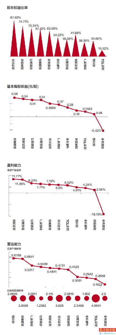 股东权益比率(又称自有资本比率或净资产比率)是股东权益与资产总额的比率,股东权益比率与资产负债率之和等于1,这两个比率从不同的侧面来反映企业长期财务状况,股东权益比率越大,资产负债比率就越小,企业财务风险就越小,偿还长期债务的能力就越强。光弘科技、华阳集团和红墙股份的股东权益比都超过7成,其中光弘科技更高达8成,TCL集团垫底,不到2成。
