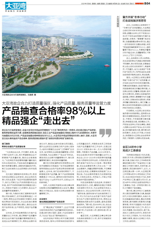 政企合力打造质量强区,这是大亚湾区市场监督管理局在“十三五”期间肩负的一项使命。该区通过强化产品质量、服务质量等的监管力度,全面推进质量强区建设,辖区工业产品监督抽查批次数量以每年10%的速度增长,年