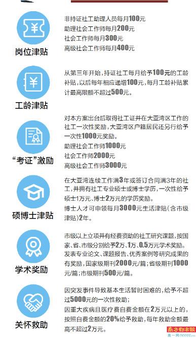 《方案》要求,建立社会工作人才岗位津贴激励机制。将对在大亚湾区提供全职社工服务的非持证社工助理人员、已考取社工职业水平证书且在大亚湾区从事全职社工服务的人员给予岗位津贴。非持证社工助理人员每月100元,助理社会工作师每月200元,社会工作师每月300元,高级社会工作师每月400元。