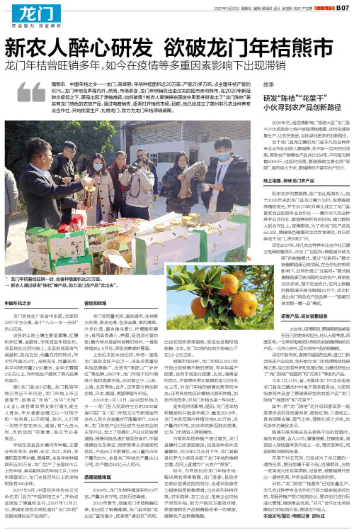 南都讯 中国年桔之乡——龙门,高峰期,年桔种植面积近20万亩,产量20多万吨,占全国年桔产量的80%。龙门年桔蜚声海内外。然而,市场多变,龙门年桔销售也由过去的旺市走向熊市,在2020年新冠肺炎疫情之