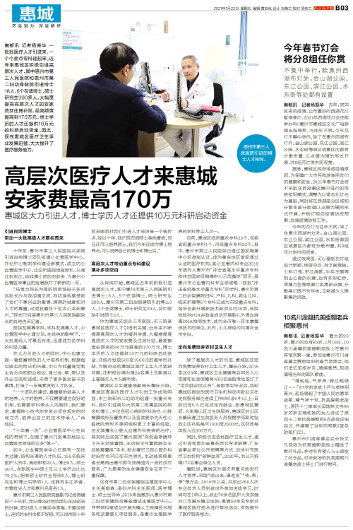 南都讯 记者杨振华 一批批医疗人才引进来,一个个重点专科建起来。近年来惠城区积极引进高层次人才,其中惠州市第三人民医院和惠州市第二妇幼保健院引进博士18人,6个在读博士,硕士研究生300多人。大幅度提