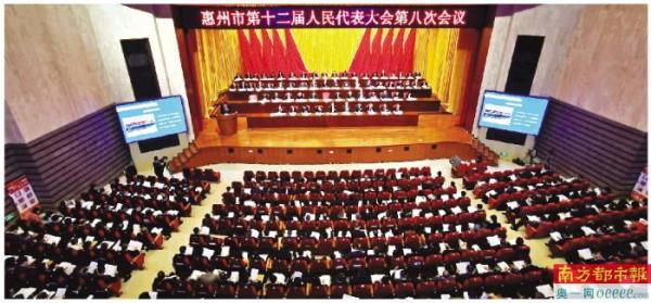 惠州市十二届人大八次会议开幕,代表们认真听取报告。