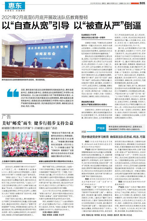 日前,惠东县举行政法队伍教育整顿专场新闻发布会。惠东县委副书记、县委政法委书记、县委政法队伍教育整顿工作领导小组常务副组长、办公室主任田建容介绍了教育整顿有关情况,从2021年2月底至6月底开展政