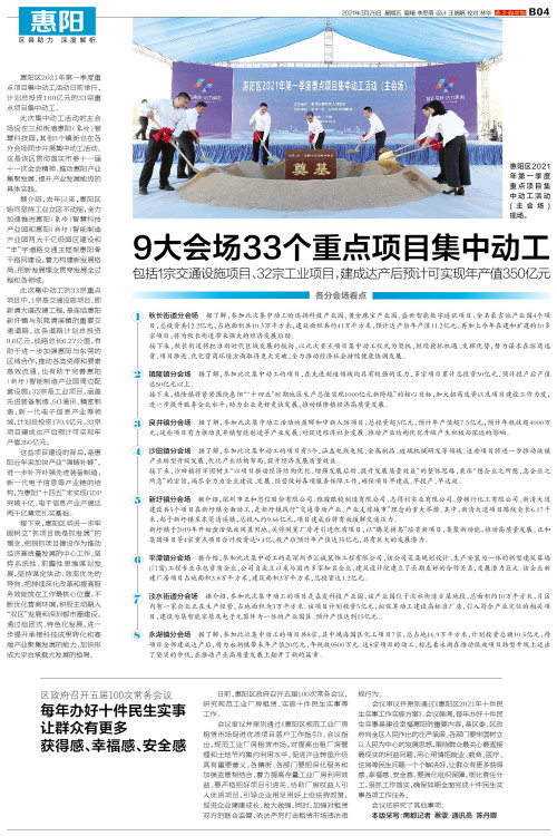 惠阳区2021年第一季度重点项目集中动工活动日前举行,计划总投资180亿元的33宗重点项目集中动工。 此次集中动工活动的主会场设在三和街道惠阳(象岭)智慧科技园,其他8个镇街也在各分会场同步开