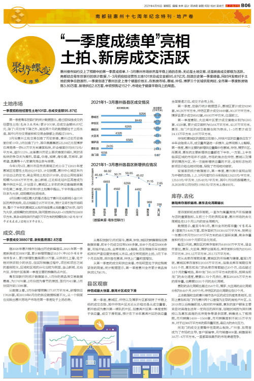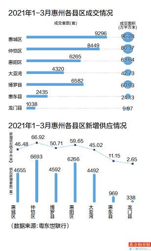南都结合粤东世联行的统计数据,1-3月招拍挂经营性土地101宗总成交金额95.87亿元,创造历史第一季度峰值。同时开发商对于土地的竞争日趋激烈,一季度创造了惠州历史上单个楼面价地王。在新房市场,惠城、仲恺、博罗三个区域供需两旺,全市第一季度新房销售3.89万套,新增供应2.8万套,申领预售证152个,市场处于健康平稳向上的局面。