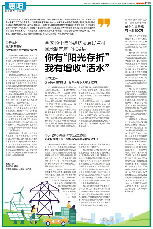 “在政府的帮助下,村里建成了一座总装机容量73千瓦的光伏发电站,如今已经全部实现并网,每年可为村集体带来五六万元的稳定收入。”在惠阳区平潭镇鹤湖村,一块块蓝色光伏硅晶面板格外醒目,这是财政补助50万元