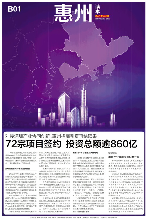 “72宗来自大湾区的项目签约,投资总额逾860亿元,涉及高端装备制造、电子信息、医疗器械等多个领域。”在4月20日举行的深圳-惠州产业协同创新对接交流会上,惠州招商引资工作再传捷报。深圳研发惠州转化成