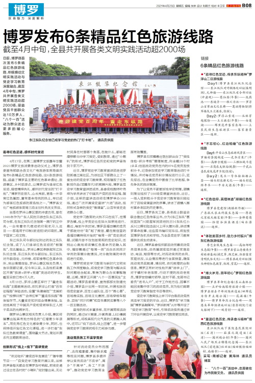 日前,博罗县首次发布6条精品红色旅游线路,积极推动文明实践活动与党史学习教育深度融合。截至4月中旬,博罗共开展各类文明实践活动超2000场,受益党员干部群众达10万多人,“八个一百”活动为群众送去更多