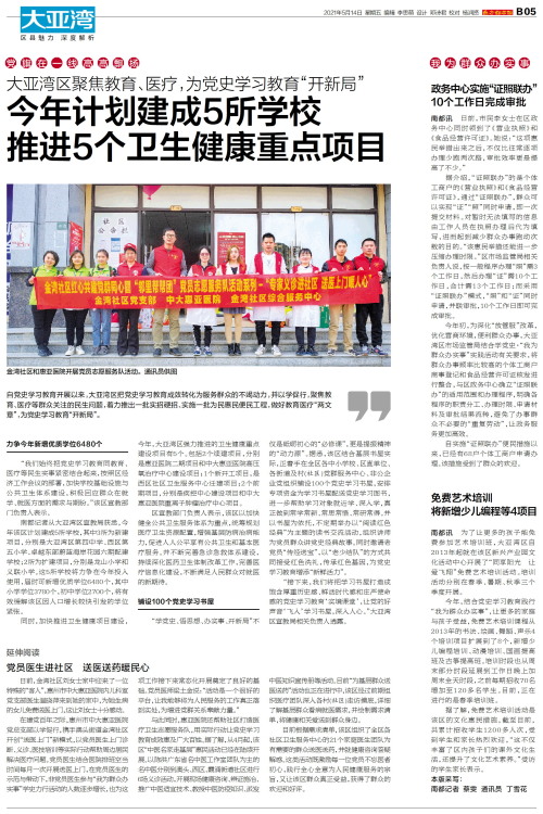 党旗在一线高高飘扬 自党史学习教育开展以来,大亚湾区把党史学习教育成效转化为服务群众的不竭动力,并以学促行,聚焦教育、医疗等群众关注的民生问题,着力推出一批实招硬招、实施一批为民惠民便民工程,做