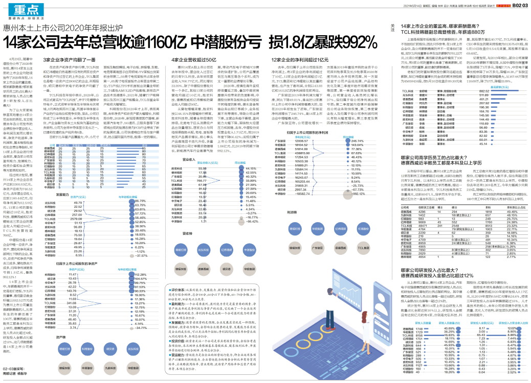 4月29日,随着中潜股份公布了2020年年报,惠州14家本土注册的上市企业均陆续发布了2020年年报,14家上市企业的董监高,哪家薪酬最高?哪家高学历员工的占比最大?哪家研发人员占比最多?研发投入