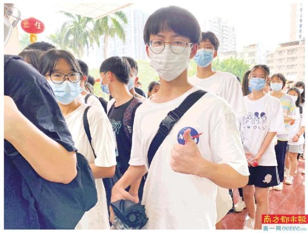 博罗中学考点,考生竖起大拇指为自己加油鼓劲。