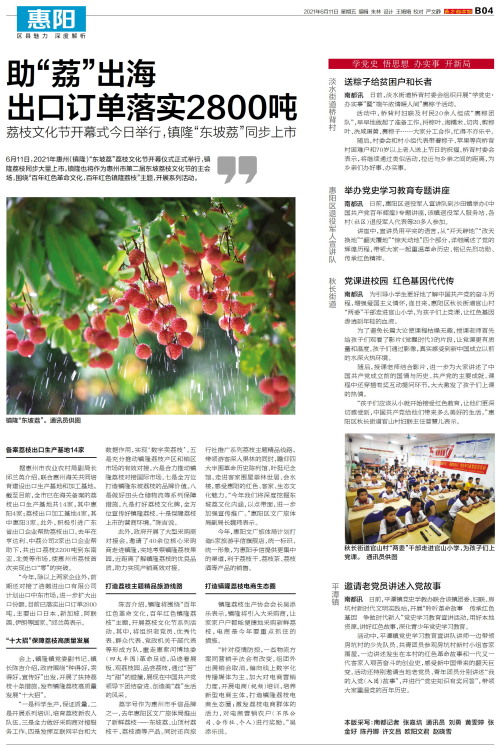 6月11日,2021年惠州(镇隆)“东坡荔”荔枝文化节开幕仪式正式举行,镇隆荔枝同步大量上市。镇隆也将作为惠州市第二届东坡荔枝文化节的主会场,围绕“百年红色革命文化,百年红色镇隆荔枝”主题,开展系
