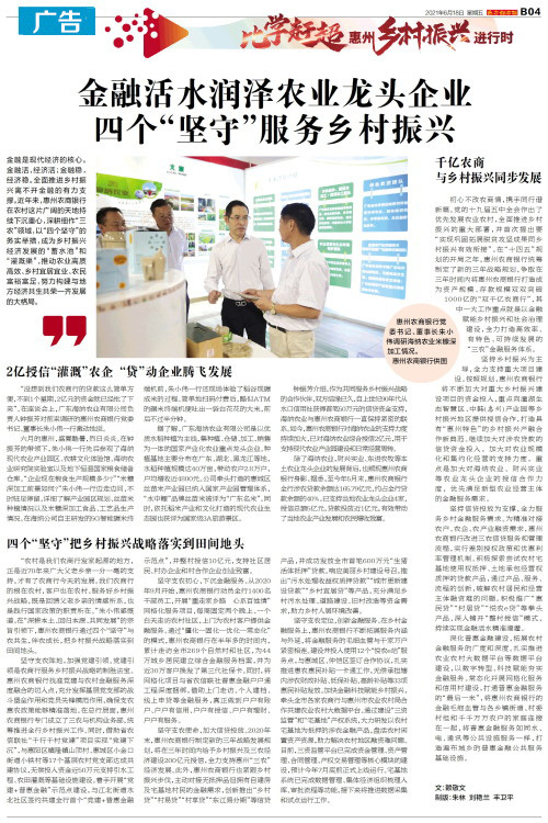 金融是现代经济的核心。金融活,经济活;金融稳,经济稳。全面推进乡村振兴离不开金融的有力支撑。近年来,惠州农商银行在农村这片广阔的天地持续下沉重心,深耕细作“三农”领域,以“四个坚守”的务实举措,成