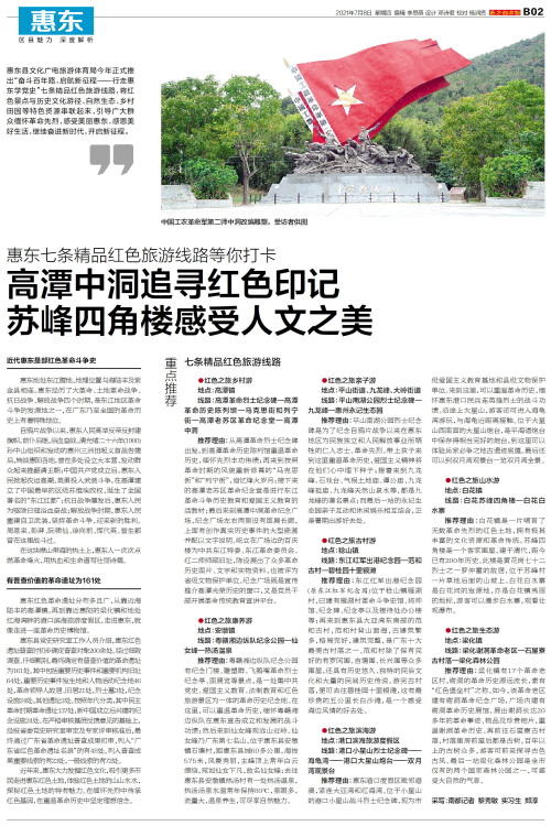惠东县文化广电旅游体育局今年正式推出“奋斗百年路,启航新征程——行走惠东学党史”七条精品红色旅游线路,将红色景点与历史文化游径、自然生态、乡村田园等特色资源串联起来,引导广大群众缅怀革命先烈,感受