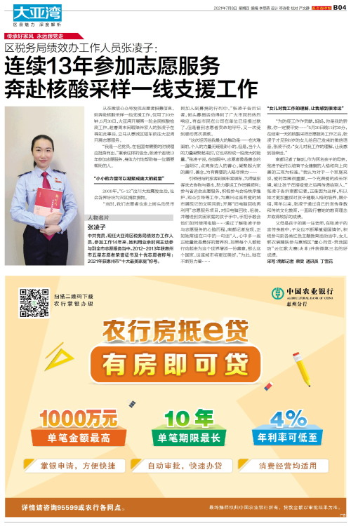 传承好家风 永远跟党走 人物名片 张凌子 中共党员,现任大亚湾区税务局绩效办工作人员。参加工作14年来,她利用业余时间主动参与到全市志愿服务当中。2012-2013年获惠州市五星志愿者荣誉