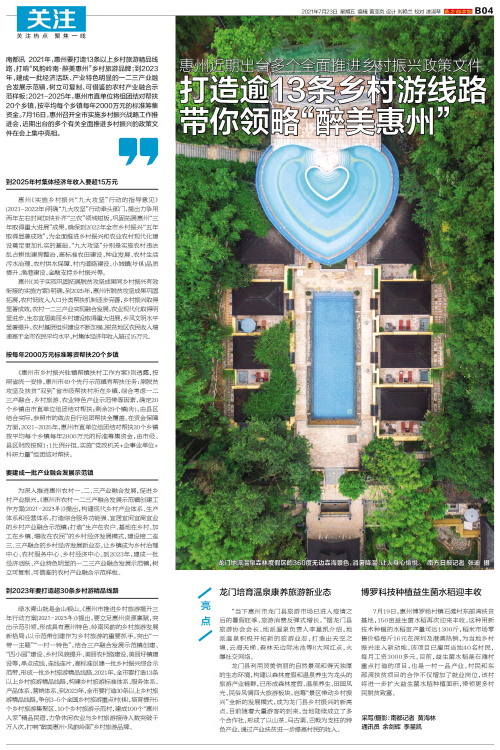 南都讯 2021年,惠州要打造13条以上乡村旅游精品线路,打响“风韵岭南·醉美惠州”乡村旅游品牌;到2023年,建成一批经济活跃、产业特色明显的一二三产业融合发展示范镇,树立可复制、可借鉴的农村产
