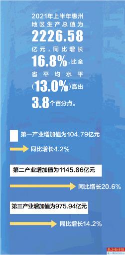 根据广东省地区生产总值统一核算结果,2021年上半年惠州地区生产总值为2226.58亿元,同比增长16.8%,比全省平均水平(13.0%)高出3.8个百分点;两年平均增长5.7%,比全省平均水平(5.0%)高出0.7个百分点。南都记者从惠州市统计局了解到,上半年惠州经济持续稳定恢复,生产需求继续回升,消费继续恢复,主要宏观指标处于合理区间,经济发展呈现稳中加固、稳中向好态势。其中,第一产业增加值为104.79亿元,同比增长4.2%,两年平均增长4.7%;第二产业增加值为1145.86亿元,同比增长20.6%,两年平均增长6.8%;第三产业增加值为975.94亿元,同比增长14.2%,两年平均增长4.7%。