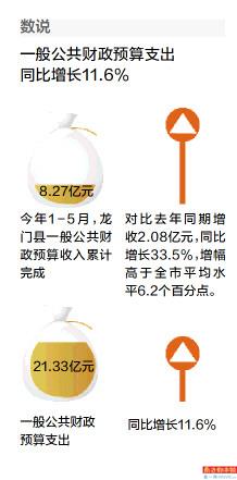 据统计,今年1-5月,龙门县一般公共财政预算收入累计完成8.27亿元,对比去年同期增收2.08亿元,同比增长33.5%,增幅高于全市平均水平6.2个百分点。一般公共财政预算支出21.33亿元,同比增长11.6%;其中,财政用于民生相关的八项支出16.90亿元,占一般公共预算支出的79.23%,比去年同期提高4.1个百分点。其中城乡社区支出、卫生健康支出、社会保障和就业支出高速增长,分别增长192.4%、99.9%和74.2%。