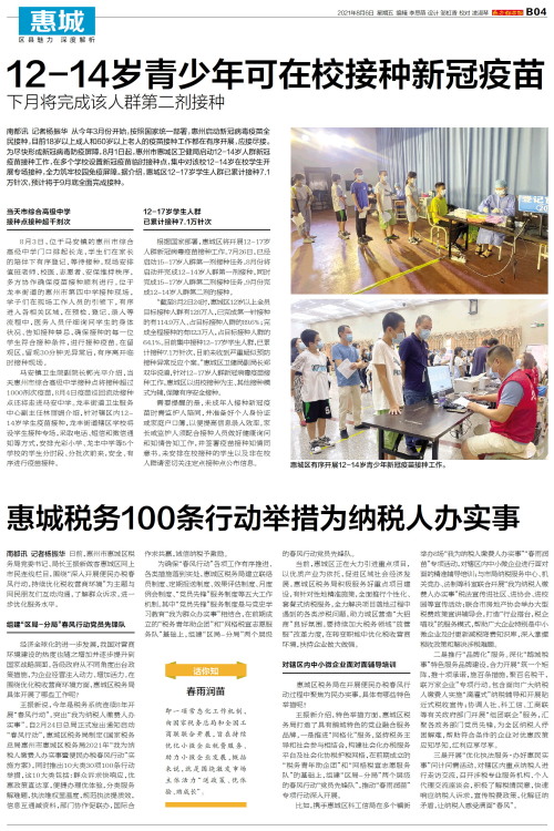 南都讯 记者杨振华 从今年3月份开始,按照国家统一部署,惠州启动新冠病毒疫苗全民接种,目前18岁以上成人和60岁以上老人的疫苗接种工作都在有序开展,应接尽接。为尽快形成新冠病毒防疫屏障,8月1日起