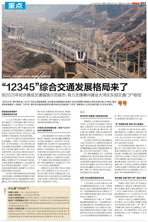 交通运输是惠州市打造珠江东岸新增长极、粤港澳大湾区高质量发展重要地区和更加幸福国内一流城市的“先行官”和重要支撑。为此惠州市交通运输局组织开展了《惠州市综合交通运输“十四五”发展规划》。按照该规划,到2025年,惠州将构建支撑双区双循环的综合立体交通网络,基本建成顺畅、安全、生态的综合交通运输体系,海陆空大交通格局初步成型,“丰”字道路交通主框架建设成效显著,对接广深莞、辐射粤东北、畅通国内外,形成“12345”综合交通发展格局。