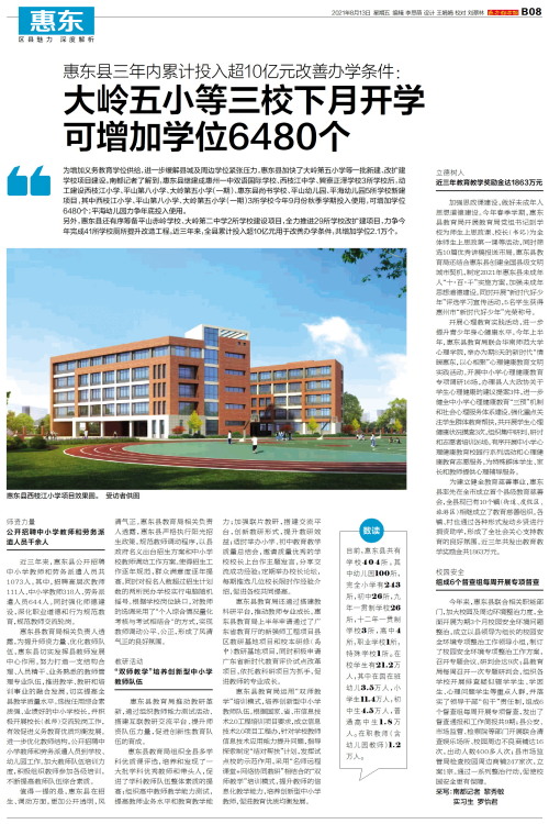 为增加义务教育学位供给,进一步缓解县城及周边学位紧张压力,惠东县加快了大岭第五小学等一批新建、改扩建学校项目建设。南都记者了解到,惠东县继建成惠州一中双语国际学校、西枝江中学、巽寮正泽学校3所学校