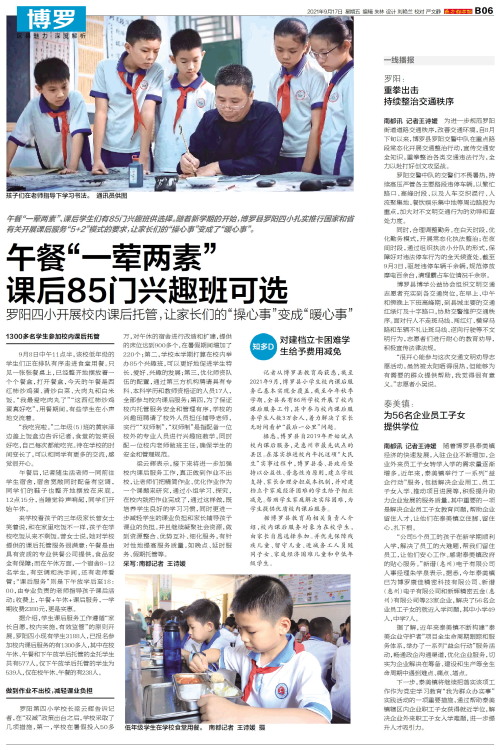 午餐“一荤两素”、课后学生们有85门兴趣班供选择。随着新学期的开始,博罗县罗阳四小扎实推行国家和省有关开展课后服务“5+2”模式的要求,让家长们的“操心事”变成了“暖心事”。 1300多名学生参