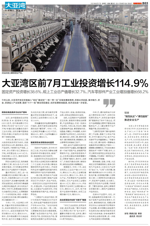 今年以来,大亚湾开发区积极融入“双区”建设和“一核一带一区”区域发展新格局,积极比学赶超,集中精力、资金、资源投入产业发展,狠抓“六个一批”推动项目建设,经济发展继续提速,经济活动进一步彰显。将供