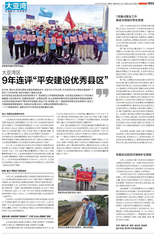 近年来,惠州大亚湾区委政法委紧紧围绕全市、全区中心工作大局,为大亚湾社会大局安全稳定和“十四五”工作开好局、起好步提供了强有力支撑。在大亚湾区全区政法机关的共同努力下,各项政法工作取得优异成绩:大