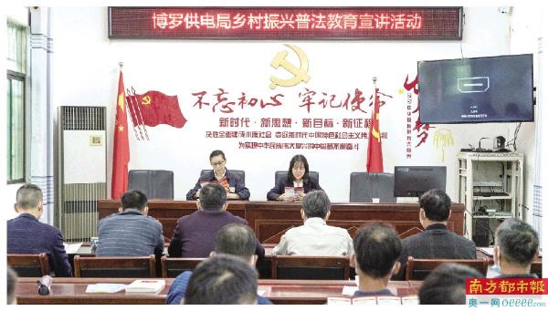 近日,南方电网广东惠州博罗供电局的普法党员服务队走进博罗县柏塘镇邹光村,开展乡村振兴普法教育宣讲活动。