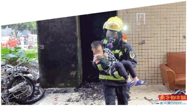 去年3月17日,惠城区水口街道湖滨德政西二路一栋3号出租屋首层楼梯间,电动自行车充电导致火灾,消防员救出一名儿童。 通讯员供图