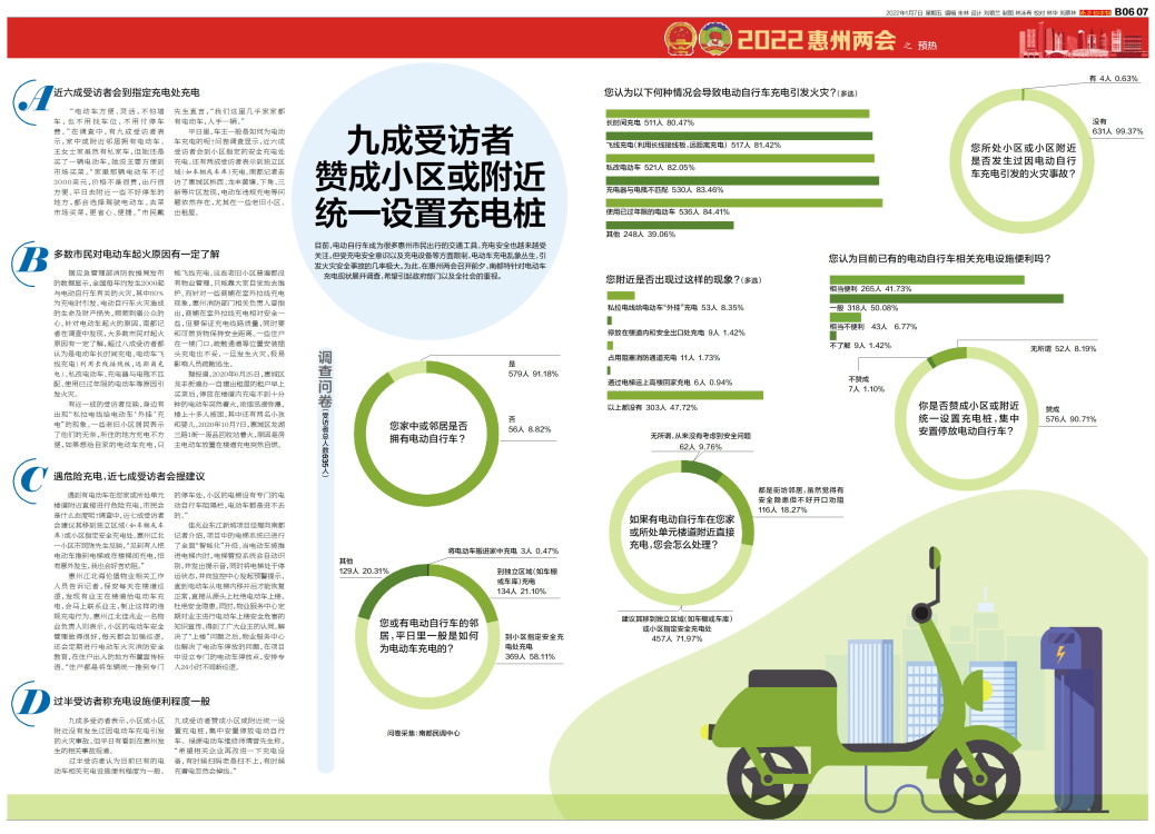 目前,电动自行车成为很多惠州市民出行的交通工具,充电安全也越来越受关注。但受充电安全意识以及充电设备等方面限制,电动车充电乱象丛生,引发火灾安全事故的几率极大。为此,在惠州两会召开前夕,南都特针对