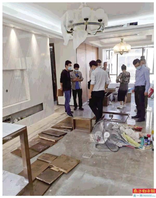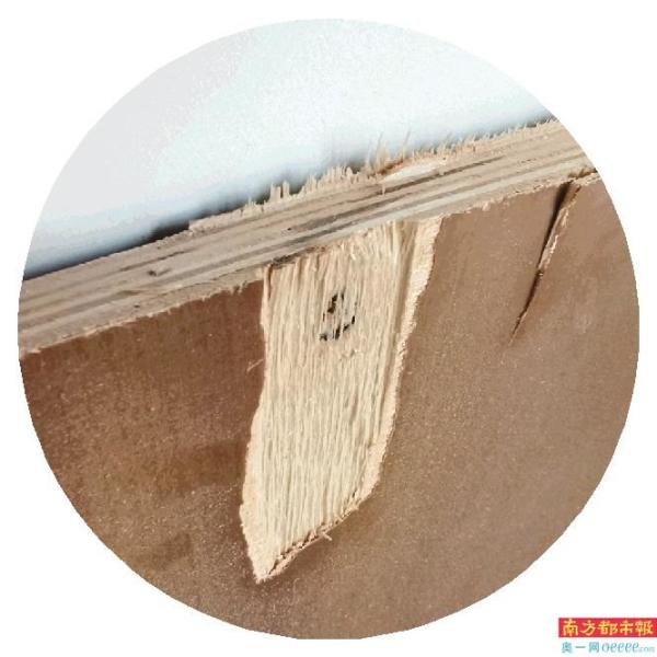 南都记者于日前来到侯先生位于惠州中洲央筑花园的住宅现场看到,目前仍未完全安装完毕的书柜、衣柜等木制家具,板面有明显脱漆和刮痕,锯开的柜体木材明显可见采用的是夹板贴皮加多层板,一个柜子出现三种喷漆颜色,柜门还有开裂、变形等情况。