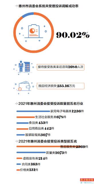 根据惠州市消委会数据,2021年,惠州市消委会系统共受理投诉3973件,在要求期限内已成功解决3585件,调解成功率为90.02%,接待接受各类来访咨询1680人次,为消费者挽回经济损失235.16万元。