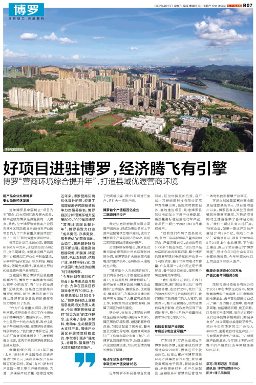 近年来,博罗营商环境优化提升明显。根据工信部赛迪研究院投资竞争力百强县排名,博罗县2021年营商环境升至第80位。2022年是博罗“营商环境综合提升年”,博罗县致力打造“成本更低、办事更快、服务更