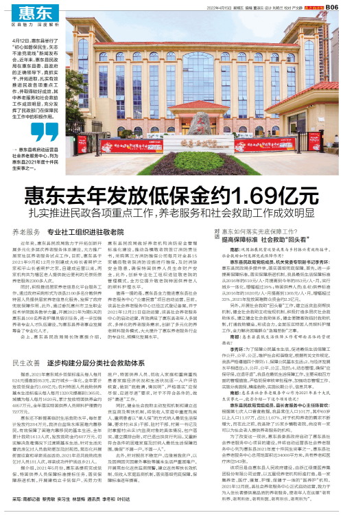 4月12日,惠东县举行了“初心如磐保民生,矢志不渝兜底线”新闻发布会。近年来,惠东县民政局在惠东县委、县政府的正确领导下,真抓实干,开拓进取,扎实有效推进民政各项重点工作,并取得较好成效,其中养老