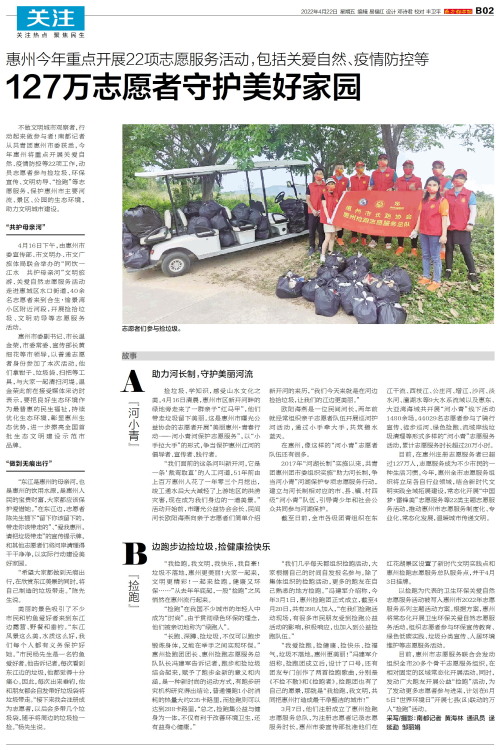 不做文明城市观察者,行动起来做参与者!南都记者从共青团惠州市委获悉,今年惠州将重点开展关爱自然、疫情防控等22项工作,动员志愿者参与捡垃圾、环保宣传、文明劝导、“捡跑”等志愿服务,保护惠州市主要河