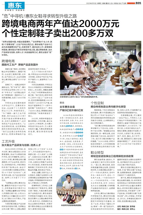 “世界女鞋看中国,中国女鞋看惠东。”“全世界每4个女人中,就有1个穿惠东鞋”。以生产时尚女鞋为主,惠东制鞋产业如今已成为该县重要支柱产业。在新形势下,面对成本上升、疫情等各种困境,惠东鞋业不断寻求转型升级之路。通过跨境电商、加大产品研发与创新、培养人才、科技赋能等方式,惠东女鞋在“危”中寻机。