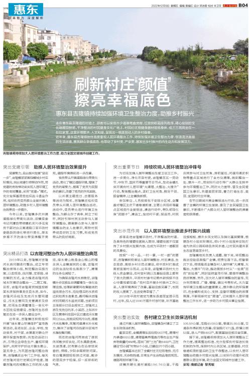 走在惠东县吉隆镇的村道上,游客可以发现不少道路笔直宽敞,垃圾回收箱排列有序,精心绘制的文化墙醒目鲜艳。干净整洁的村民健身文化广场上,村民们正用健身器材锻炼身体,或三三两两坐在一处拉家常。这里环境整