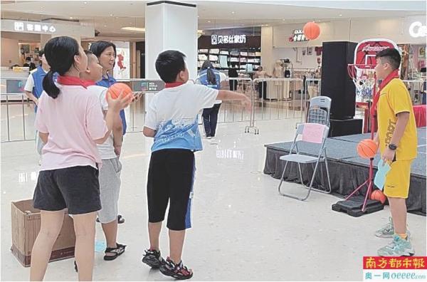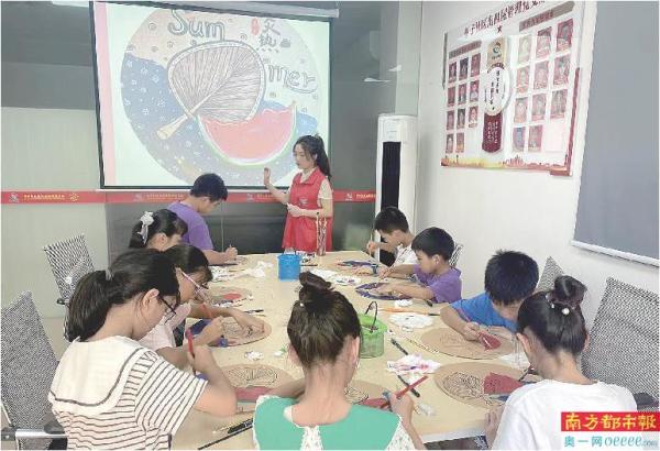 陈江街道御湖社区开展暑假托管班,教儿童蒲扇绘画。