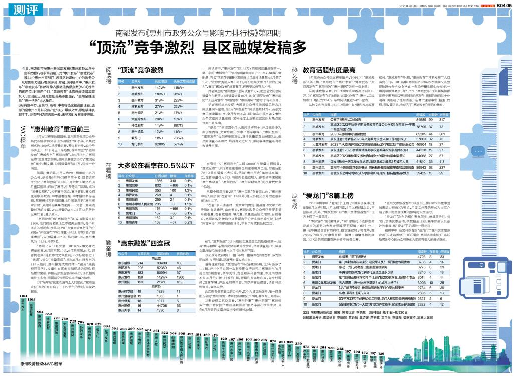 今日,南方都市报惠州新闻部发布《惠州政务公众号影响力排行榜》(第四期),对“惠州发布”“惠城发布”等44个惠州市直部门、各县区融媒体中心的政务公众号影响力进行客观评测、排名。6月榜单中,“惠州发布
