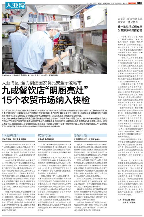 民以食为天,食以安为先。当前,大亚湾开发区严格落实“四个最严”要求,以创建国家食品安全示范城市为契机,着力推进食品安全“两个责任”落实见效、扎实推动食品生产经营单位质量整治提升、着力防范化解食品安